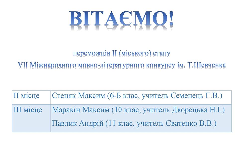 Вітаємо призерів ІІ етапу VII міжнародного мовно-літературного конкурсу ім. Т.Шевченка!