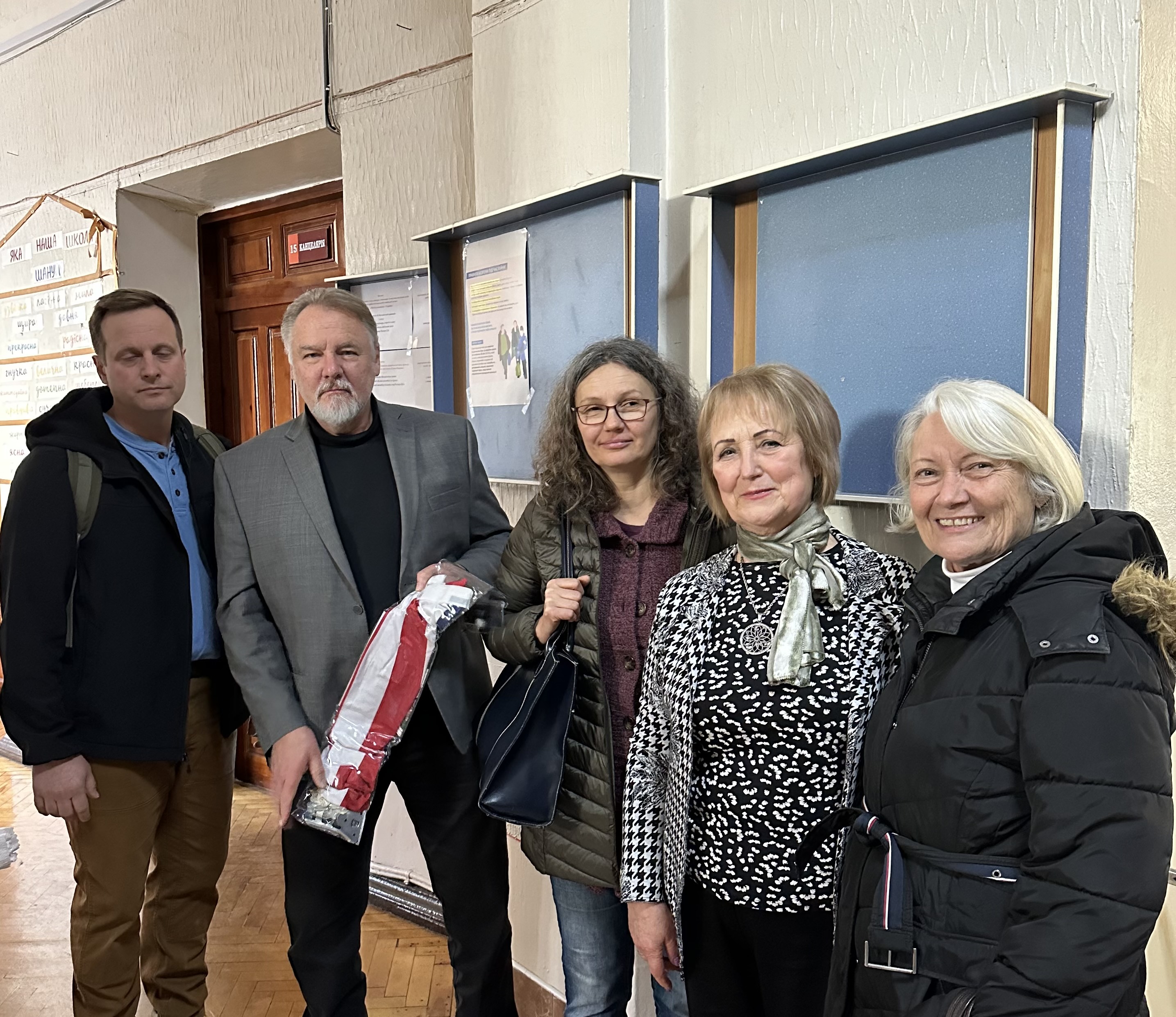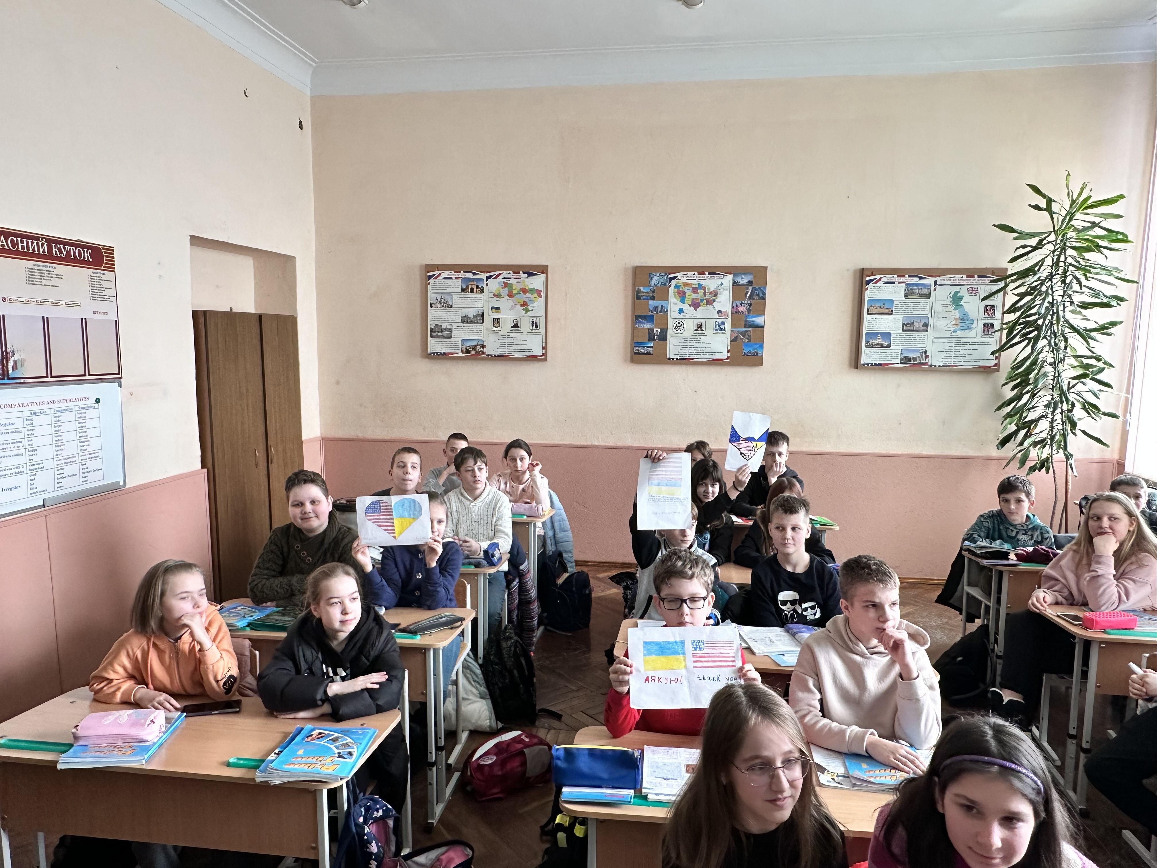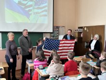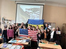 Та сьогодні вони прийшли з візитом до школи, щоб передати від себе особисто прапор Сполучених Штатів Америки для кабінету англійської мови номер 411. Пан Ніколас Одін Лейпер мав приємність поспілкуватися з учнями 6-го класу. Він розповів історію прапора своєї країни. Діти підготували малюнках, в яких відтворили символи підтримки американського нації. На згадку зробили фото зі стягами наших країн- великої Америки і незламної України!!!