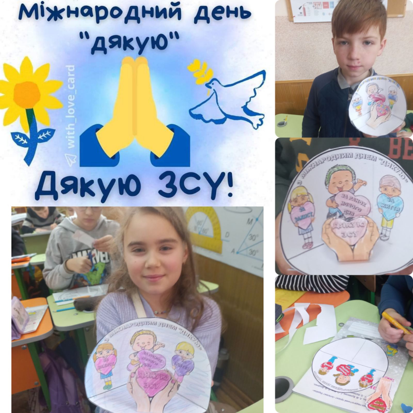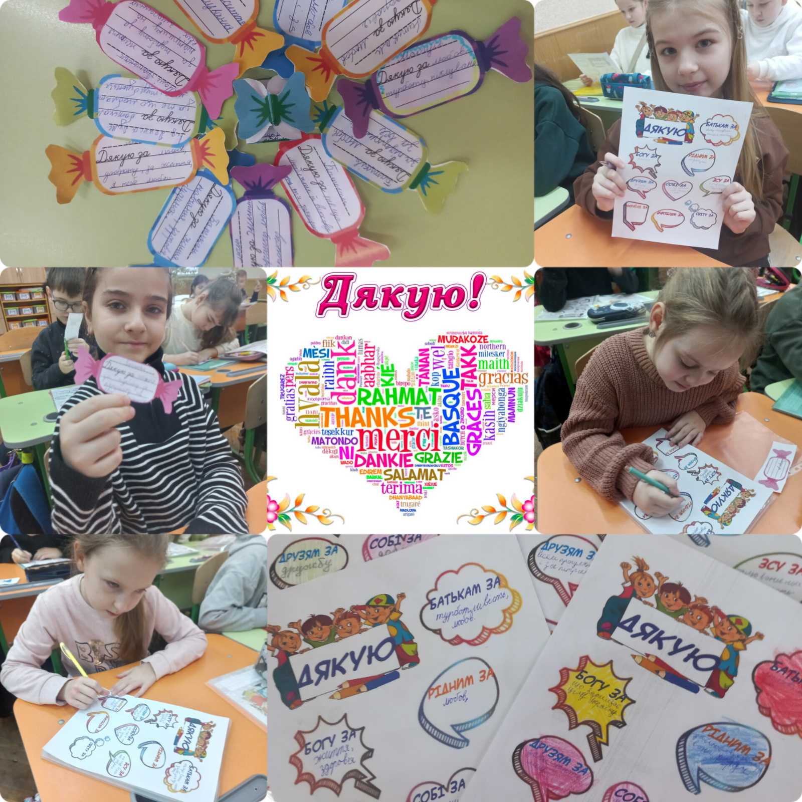 Цей день можна назвати однією з найбільш “ввічливих” дат у році. Слова подяки мають магічні властивості - з їх допомогою люди дарують один одному радість, висловлюють увагу і передають позитивні емоції. Учні 4-В класу розпочали сьогоднішній день зі слів «Я дякую…» одне одному. А також створили листівки для найдорожчих людей.