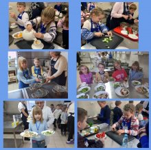 Готували Цезар, а також боул. Це така здорова тарілка, з гречкою, сиром, яйцем, петрушкою. Звучить дивно, але це смачний, дуже здоровий підхід до харчування. Також приготували чай масала без цукру, але солодкий. Діти дізналися про формування здорових харчових звичок у приготуванні та споживанні їжі.