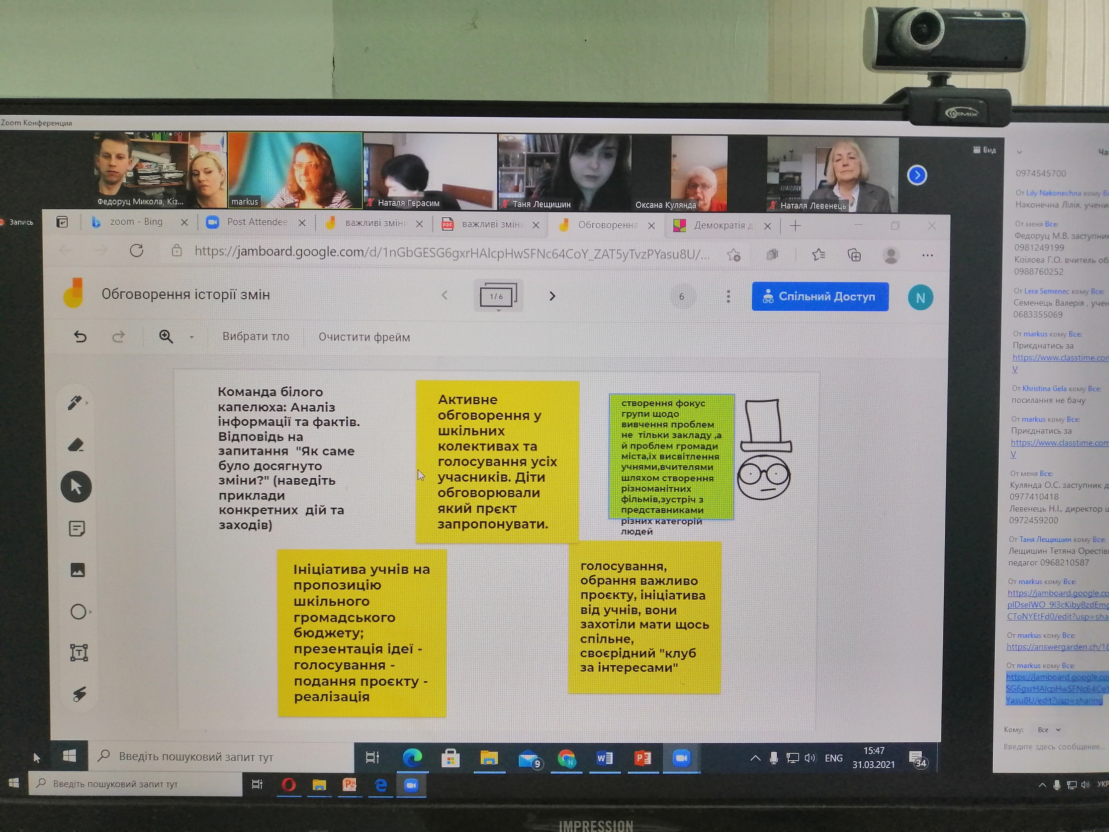 Ось і настав час розставити всі крапки над і – час підводити підсумки участі Тернопільської школи #4 у програмі підтримки освітніх реформ в Україні «Демократична школа». 31 березня в режимі онлайн відбулася чергова зустріч з тренерами проєкту Наталею Маркусь та Наталею Герасим, що мала на меті виокремити серед демократичних здобутків школи те, що стане історією успіху закладу на фінальному етапі участі в програмі. У звітному виступі координатора проєкту Федоруца М.В. пролунала розповідь про процес обговорення, розробки, моніторингу та запровадження нових правил для учнів, що були обрані як найяскравіший результат роботи в рамках програми для представлення на підсумковій зустрічі. Оскільки головним критерієм відбору є значущість і актуальність досягнутого для усіх сторін освітнього процесу – вчителів, учнів, батьків та громади, тренерами було запропоновано описати також як історію успіху процес створення в школі медіа студії, як такий, що у повній мірі відповідає зазначеним вимогам.