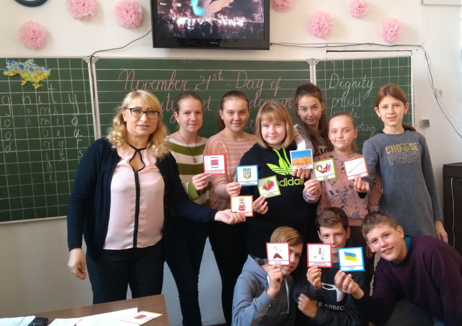 В ході підготовки до відзначення Дня Гідності і Свободи України 21 листопада вчитель англійської мови Аліна Вікторівна провела інтегровані уроки у 6-Б, 6-В, 7-Б і 7-В класах. Учні провели відеоекскурс у історію переломних подій 2013 року, дізналися чому остання революція була названа Революцією Гідності, розібралися у самому значенні слова "гідність", вивчали текст гімну України та виконували його англійською мовою. Переглянути фото...