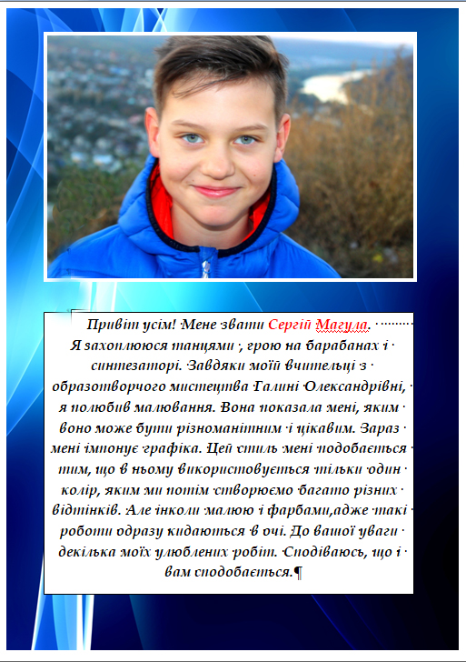 Творчість як пошук себе, як радість і виклик, як можливість поділитись своїм світом - таким, можливо, є лейтмотив виставки малюнків учня 6-В класу Магули Сергія в учнівській арт-галереї, відкриття якої відбулося 8 травня 2019 року. Як представник неймовірно обдарованої, знаної і шанованої родини у школі, Сергій не прагне перевершити успіхи сестри, Каті Магули, яка двічі демонструвала свої роботи. Він живе яскравим насиченим життям, в якому знайшов особливе місце для створення графічних та живописних робіт, цікавих та своєрідних. Радіємо і пишаємося такими учнями! Нехай натхнення дарує Сергієві багато нових вершин!